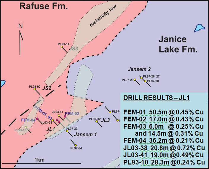 Rick Mazur, President & CEO of Forum Energy Metals commented, “This limited drill program has not only successfully confirmed the presence of high-grade copper at Janice Lake, more importantly, the continuity of copper mineralization has been demonstrated along strike and at shallow depths. With district scale copper mineralization observed over 10km, Janice Lake exhibits enormous potential to build on this early success. Forum is planning follow-up drilling this winter to test other high priority targets.”