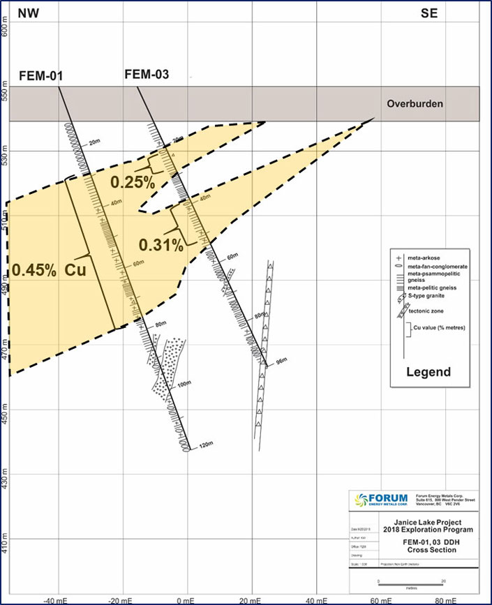 Vancouver, B.C., October 10, 2018 - Forum Energy Metals Corp. (TSX.V: FMC) (“Forum”) is pleased to announce results from its recently completed four-hole diamond drill program on its Janice Lake sedimentary copper project located in northern Saskatchewan’s Wollaston Copperbelt. All four holes encountered copper mineralization within 80 m of surface with Hole FEM-01 intersecting 19 m grading 1.00 % Copper including 5.7 m of 2.18 % Copper within a 50.5 m interval grading 0.45 % Copper. A summary of assay results are shown below in Table 1. Drill hole locations and a cross section are shown in Figures 1 and 2.