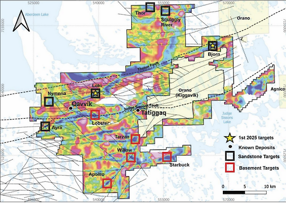The Tatiggaq drill interpretation summary, assay tables, geological cross-sections, and Hole TAT24-014 core photo can be reviewed in the link below. 2. Qavvik: Located 15 km west of the Tatiggaq deposit, two holes were completed to test uranium mineralization interesected by previous drilling conducted by Cameco in this 800mx800m gravity low anomaly. A 296m wide zone of shallow uranium mineralization with high grades of up to 8.2% U3O8 were intersected in a newly identified lense. Mineralization is open to the northeast and southwest. Hole QAV24-001 intersected a 296m wide zone of uranium mineralization comprising numerous discreet lenses from 36m-332m. Hole QAV24-002 intersected over 190m of discreet uranium mineralized lenses from 192m-384m.