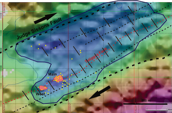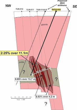Tatiggaq Main Zone Cross Section Both the Tatiggaq Main and West Zones are interpreted to be a series of near vertical uranium bearing lenses within a fault structure that trends for 1.5 km. The width of the minteralized section has yet to be determined, but has been interpreted to be approximately 50m. Future planned drilling will help determine the true width of the zone, which is open along strike and at depth.