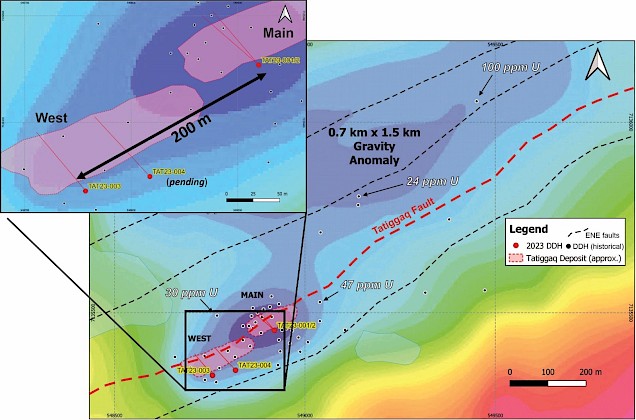 Eight holes tested parallel structures within the 0.7 X1.5km Tatiggaq gravity anomaly. All eight holes interesected clay alteration, elevated Boron and other pathfinder minerals. More importantly, Hole TAT24-021 intersected uranium mineralization in a new area named Tatiggaq North, which represents a potential new zone located 300m north of the Main Zone.