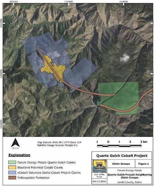 Quartz Gulch is located approximately 5 kms to the southeast of the past producing Blackbird cobalt mine (Noranda) and Jervois Mining’s Idaho Cobalt Project, the only permitted cobalt mine under development in North America. |